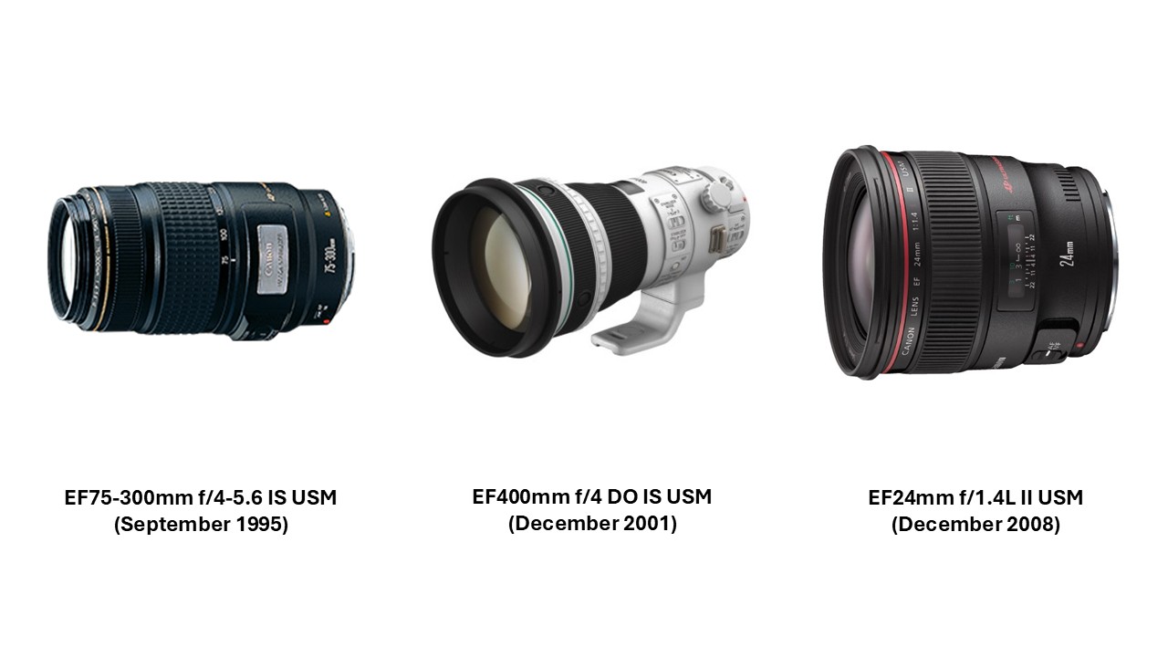 The EF lens was introduced in 1987 as the dedicated lens system for Canon’s EOS autofocus single-lens reflex film camera, debuting simultaneously with the EOS system itself. Since their inception, EF lenses have led the industry by incorporating a series of world-first technologies, including the Ultrasonic Motor (USM), Image Stabilizer (IS) technology, and a multilayered Diffractive Optical (DO) element, and have undergone numerous evolutions.