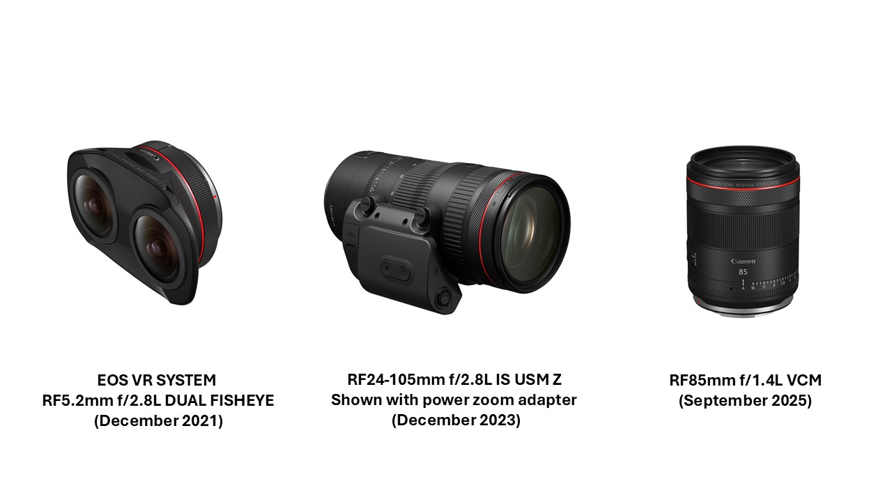 In 2021, Canon launched the EOS VR System, a VR video system consisting of a mirrorless camera[1], dedicated lens, and PC software, thereby creating a 3D 180° VR video through an interchangeable lens camera. In 2024, Canon began rolling out a new series of hybrid lenses equipped with iris rings, designed to meet the needs of both still photography and professional video production. For zoom lenses, the company has also launched RF24-105mm f/2.8L IS USM Z and RF70-200mm f/2.8L IS USM Z which are compatible with power zoom adapters. For single focus lenses, the company released F1.4 L hybrid prime lens series that unified the size and ring and button position across models. In September 2025, Canon launched RF85mm f/1.4 L VCM, the fifth model in this series, demonstrating that it can meet demands in line with the changing times.