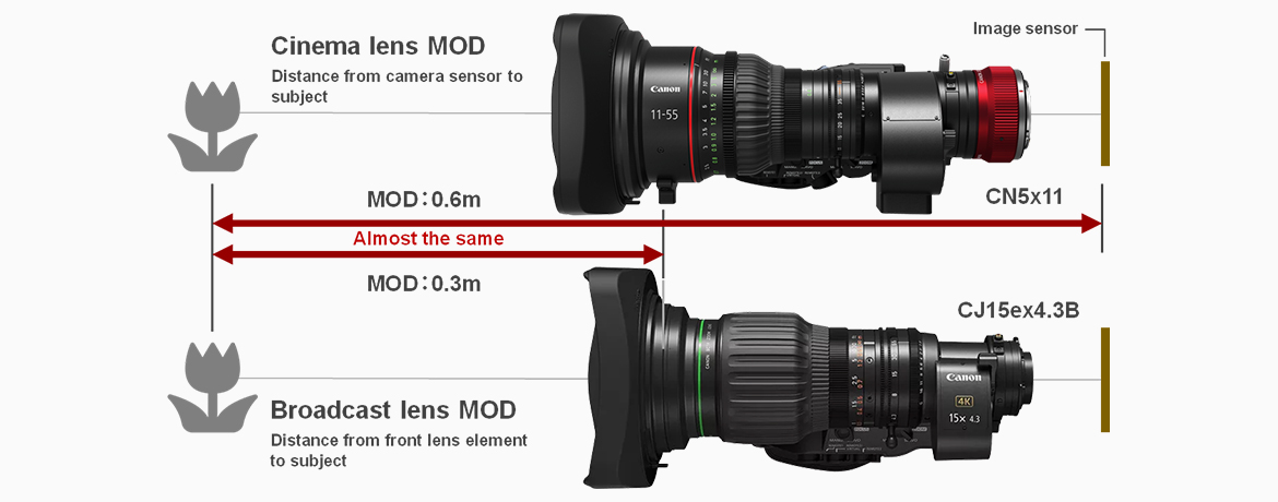 MOD values are defined differently for broadcast and cinema lenses. Although the CN5 x 11 IAS T (RF/PL) and CJ15ex4.3B list different MOD figures on their specification sheets, they both deliver about the same working distance in practice.