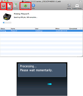 After deleting the print job, the message "Processing..." continues to be displayed on the side of the printer. (Macintosh)