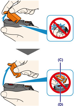 - Do not touch the inside of the orange protective cap (C) or the open ink port (D). The ink may stain your hands if you touch them.