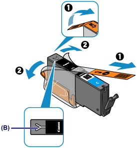 - If the orange tape remains on the Y-shape air hole (B), ink may splash or the printer may not print properly.