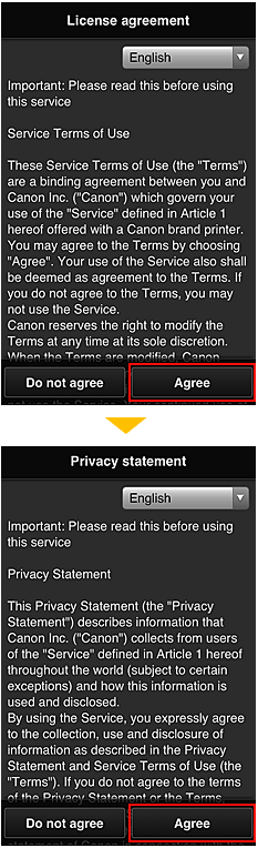 8. In the [ License agreement ] and [ Privacy statement ] windows of Canon Inkjet Cloud Printing Center, read the statements, and select [ Agree ] if you agree.