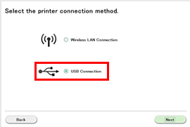 8. When the Printer Connection screen appears, connect the machine to the computer with a USB cable.