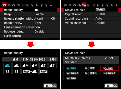 ], and then select the image quality from the screen that appears. - For movies, select [Movie rec. size] from the [