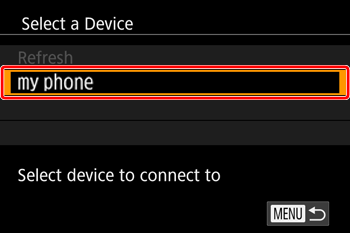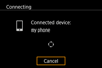 A-7. After a connection is established with the smartphone, the smartphone’s name is displayed on the camera. (This screen will close in about one minute.)